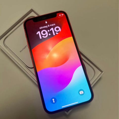 Apple iPhone 12 mobiltelefon mini lila med 64 GB internminne. Monterat skärmskydd. Modellen har pekskärm och Face ID. Enheten på bilderna visas i ett vikbart lila fodral med kortfack. Lämplig för vardaglig användning, surf, appar och kommunikation.