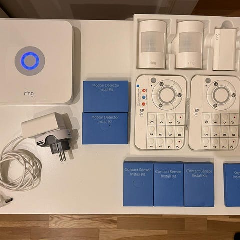 Ring Alarm trådlöst hemlarm 5-delars kit i vit färg. Systemet består av basstation, knappsats, rörelsedetektor, dörr-/fönstersensor samt räckviddsförlängare. Larmet är avsett för inomhusbruk och kan övervakas och styras via mobilapp. Passar för grundläggande övervakning av bostad med sensorer för rörelse och öppning av dörrar eller fönster.