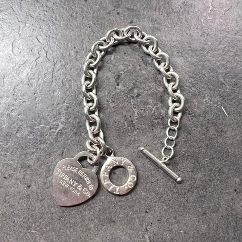 Tiffany & Co armband i silver för unisex. Armbandet har en kedja med runda länkar och ett dekorativt nyckelformat hänge. Märkt Tiffany & Co 925, vilket anger sterlingsilver. Passar att bära till vardags eller vid mer uppklädda tillfällen.