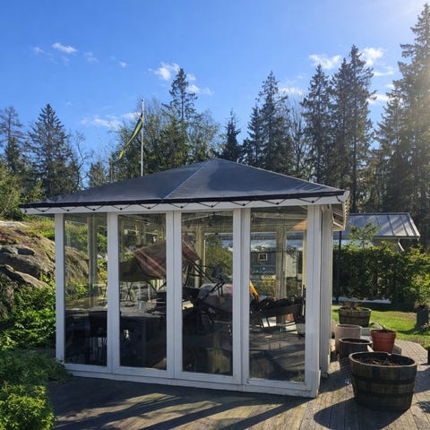 Lusthus/Paviljong i trä bottenmötet 2m diagonalt med åttakantig form och öppna sidor. Konstruktionen är i omålat trä med räcken runt om och trägolv. Taket är flersidigt och täckt med takbeläggning/plåt Passar som uteplats eller samlingsplats i trädgård eller på gård ring mig om pris om du vill ha hjälp med transport innom Uppsala mvh