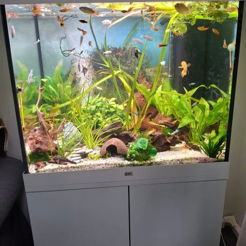 20 stycken neontetror, 20 koppartetror, fyra kuhliålar, någon enstaka guppy och en militärhjälms-snäcka.
