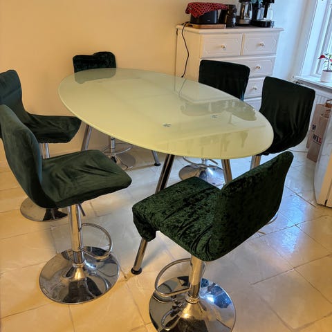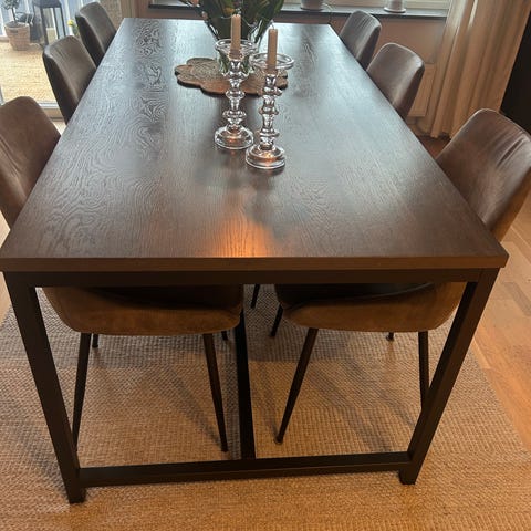 Matbord med 6 stolar av sammet fint skick förutom en flyttskada på hörnet (se bilden) säljes pga flytt