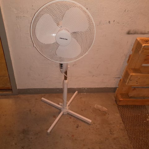 Vit golvvärmefläkt med rund fot och justerbart stativ. Fläkten har skyddsgaller runt rotorbladen och ansluts med sladd till vägguttag. Passar för användning inomhus, till exempel i hem eller kontor, för cirkulering av luft i rummet.