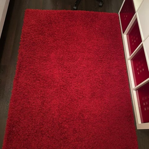 Stor matta i röd färg. Mattan har lång lugg (50mm) och är 290x200cm stor. Bra skick!