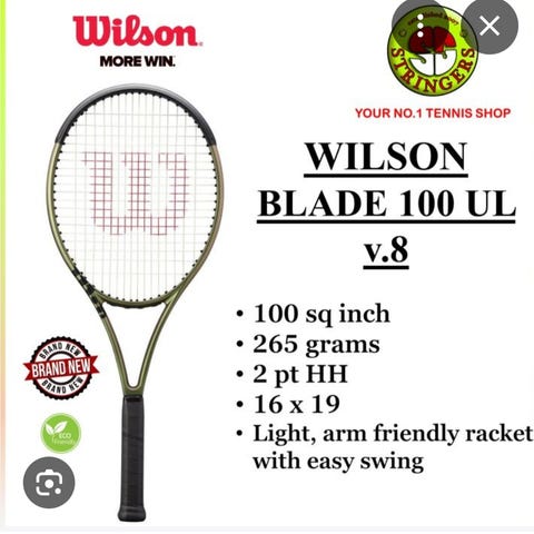 Wilson Blade V8 100 tennisracket i grön färg. Racketen har en träffyta på 100 in² (645 cm²) och väger 300 g. Balanspunkten är 32 cm (7 pts HL) och ramen har en tjocklek på 23–23–23 mm. Greppstorlek 1 (4 1/8). Racketen är avsedd för tennis och passar spelare som vill ha en standardstorlek på racket med medelvikt och huvudlätt balans.