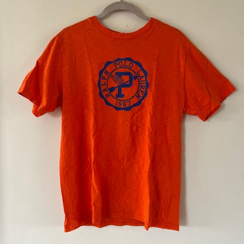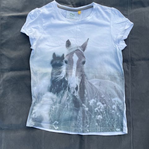KappAhl t-shirt för barn, i storlek 130. T-shirten är blå och tillverkad i bomull. Kortärmad modell med rund hals. Motiv med ryttare och häst framtill.