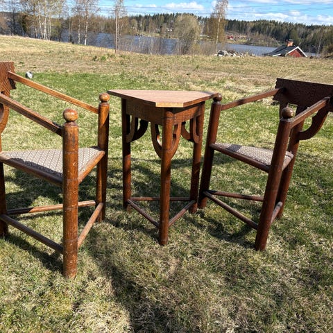 Stolar i trä med stoppad sits i beige tyg med blommigt broderi. Ryggstöd med rundad form och dekorerad överdel. Frambenen är svängda och bakbenen något lutande. Passar som sittmöbel i exempelvis vardagsrum, matsal eller hall.