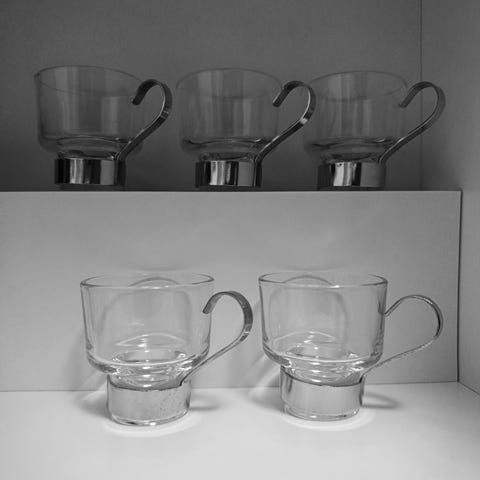 Ett set med glas med tillhörande metallhållare. Perfekt för varma eller kalla drycker.