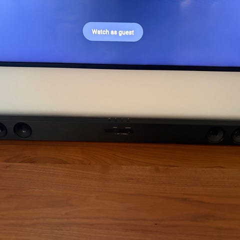 LG soundbar i svart utförande. Ljudlimpan är avsedd för användning tillsammans med TV eller annan ljudkälla. Enheten har trådlös anslutning via Bluetooth enligt märkningen på baksidan. På ovansidan finns knappar för grundläggande styrning och medföljande fjärrkontroll ger möjlighet att justera volym, byta källa och använda olika ljudlägen. Soundbaren kan placeras framför TV:n eller monteras nära denna för att förbättra ljudet vid film, serier och musikuppspelning.