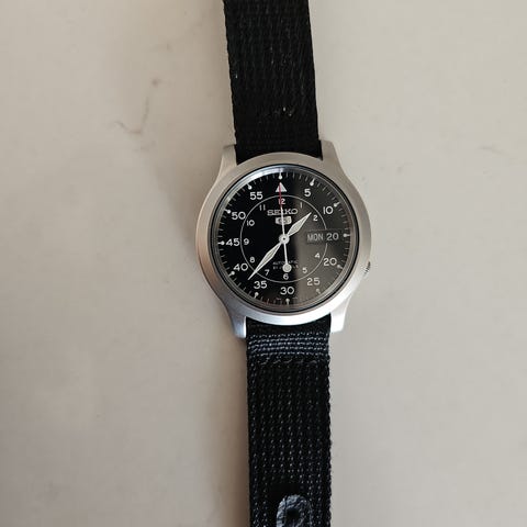 Säljer en Seiko 5 GMT som tyvärr mest samlar damm. Boetten är i metall och har en roterbar ring med 24-timmarsmarkeringar. Klockan har datumvisning vid klockan tre och en extra visare för 24-timmars- eller GMT-funktion. Armbandet är i svart gummi med klassiskt spänne.