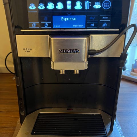 Siemens helautomatisk 2-koppars espressomaskin i rostfritt utförande.
