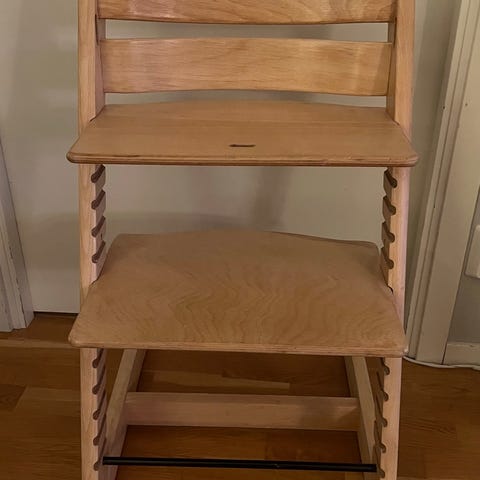 Stokke Tripp Trapp matstol i vitmålat trä. Sits och fotbräda är flyttbara i höjd och djup.