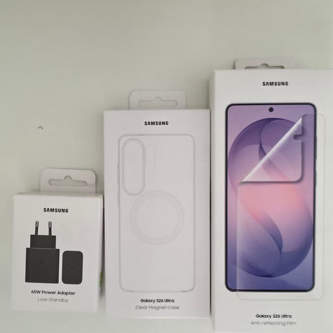 Paket med laddare, skal och skärmskydd till Samsung S26. Nytt oöppnad. Original.