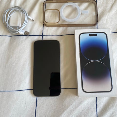 Apple iPhone 14 Pro smartphone med 256 GB intern lagring. Modellen har pekskärm och kör operativsystemet iOS. Lagringsutrymmet på 256 GB ger plats för appar, bilder, video och andra filer. Lämplig för vardagsanvändning, arbete, sociala medier, foto och video. Telefonen är i mycket gott skick utan defekter och batterihälsa på 84%.