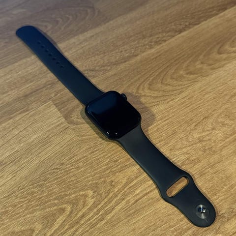 Apple Watch smartklocka med 45 mm aluminiumboett. Klockan har en rektangulär skärm och levereras med en vävd grön klockrem. Passar för vardagsanvändning, träning och notifieringar från ansluten iPhone. Levereras med originalförpackning enligt bild.
