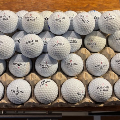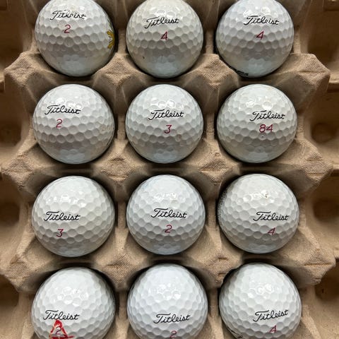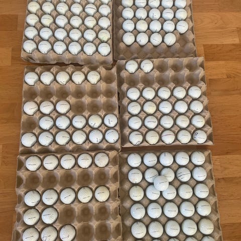 Sonens extraknäck är att/hitta/tvätta/putsa/sälja upphittade golfbollar. Han har ett mkt stort lager med bollar i mkt bra till bra skick.