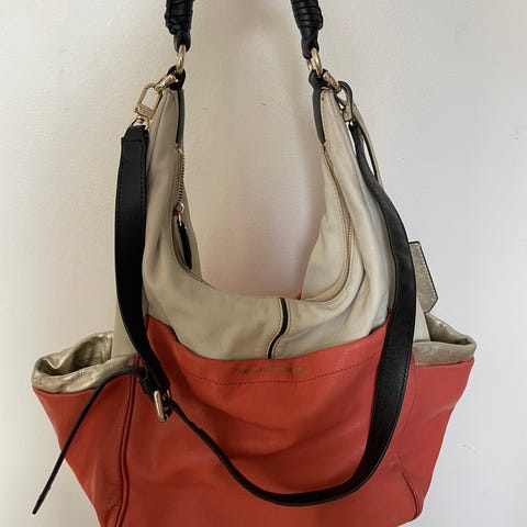Benvitt konstgjort skinn, svart mocka-lock och orange handtag.