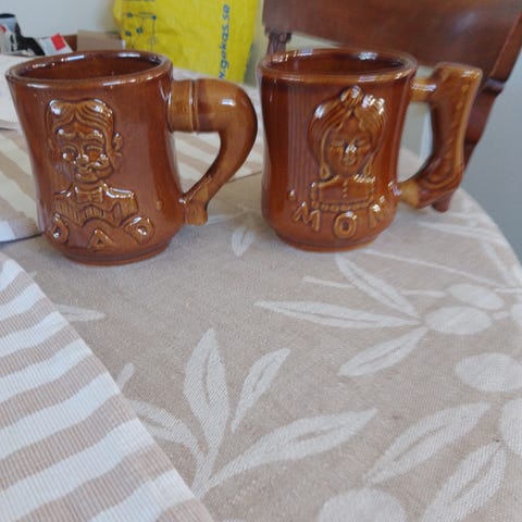Engelska muggar Mum& dad i brun keramik. Två stycken muggar med reliefmotiv på utsidan. Passar för servering av varma drycker som kaffe, te eller choklad. Tjockt gods och rejält handtag som ger stabil känsla vid användning. Kan användas i kök, på kontor eller vid dukning i hemmet.