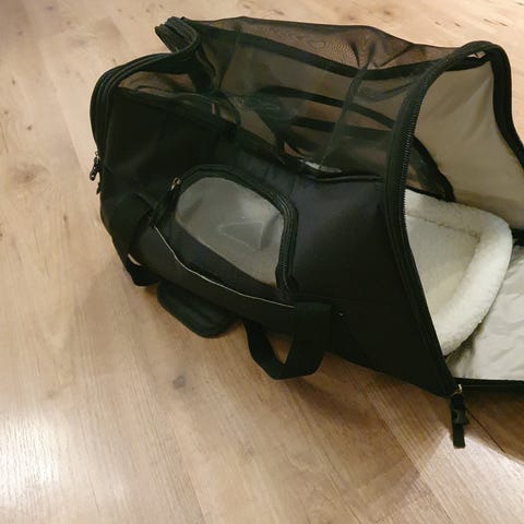 Ryggsäck modell transportväska för katt i brun färg med svart kant. Väskan har kupolformad fönsteröppning i plast framtill och flera ventilationshål. Bärhandtag upptill samt två vadderade axelremmar på baksidan gör den möjlig att bära både i hand och på ryggen. Lämplig för transport av mindre husdjur som katt eller liten hund.
