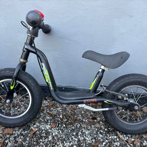 Pinepeak balanscykel för barn med 12" hjul. Cykeln är svart med vita fälgar och har låg ram som underlättar för barnet att kliva av och på. Utrustad med sadel och styre anpassade för mindre barn. Passar bra för att öva balans och koordination innan övergång till trampcykel.