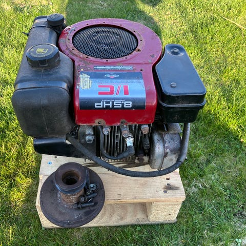 Briggs & Stratton bensinmotor 12,5 HP. Startar men stannar efter en stund. Svarta puffar. Behöver service, kanske mer.