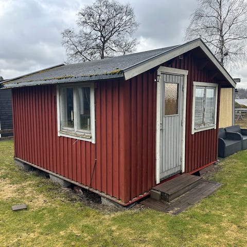 "Äldre missionshus i trä med röd träfasad och plåttak. Byggnaden har flera fönster i originalstil och en enkel entré........ " Och där slutade AI och jag tar över. Huset är i så pass risigt skick att renovering känn ofantligt dyrt. Tomten är på ca 1750kvm och ligger ett stenkast från Faxälven. Virket på takstolar och innerväggar är däremot i bra skick och med lite tid och ork så kan man plocka ihop en hel del bra material. Tyvärr är samtliga rutor sönderslagna och bågarna även dem rätt risiga.