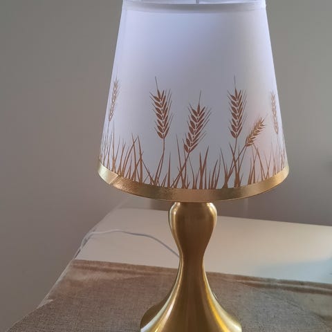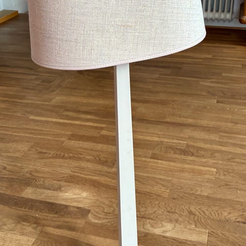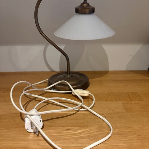 Bordslampa i metall med vit konformad lampskärm. Lampfoten är rund i metall med borstad finish och en böjd lampstomme. Lampan har sladd med strömbrytare och är avsedd för inomhusbruk, exempelvis på skrivbord, sängbord eller sidobord. Passar standardglödlampa med vanlig sockel (ej inkluderad om inget annat anges).