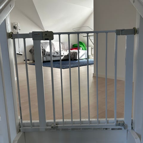 Säljer en BabyDan Asta säkerhetsgrind i vit metall. 73,5–86,5 cm bredd. Mycket smidig att använda och installera. Vi har använt både mot vardagsrum och balkong för att kunna ha dörren öppen.