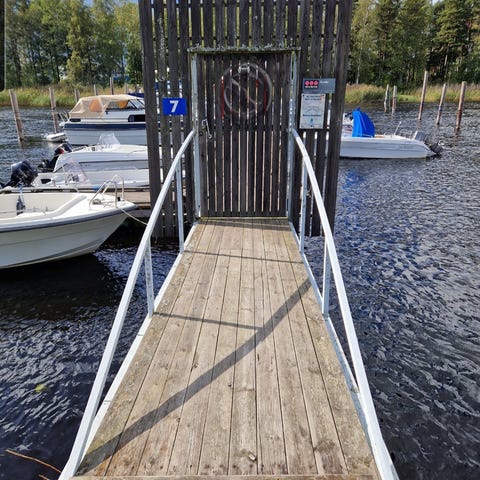 Badstege/ bryggstege/ båtstege gjord i aluminium för brygga eller kajplats. Mycket rejäl och stark konstruktion som gör det lätt att komma ner i och upp ur vattnet eller när du ska stiga av och på din båt. På bilderna står den lutad mot en stomme till en studsmatta som givetvis inte ingår.
