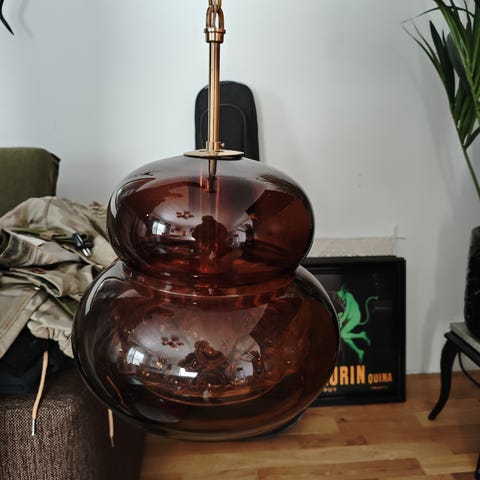Taklampa i glas och mässing från tidigt 80-tal, felfri och i nyskick. Diameter 34 cm, höjd 25 cm och kedjans längd 88 cm.