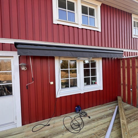 Motordriven terrassmarkis i ljusgrå färg, halvkassett i aluminium.