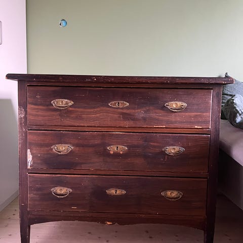Lovely antique sideboard in dark wood. On the top there is a little bit of the dark wood missing. We just had something standing on it so it did not show :) .