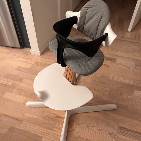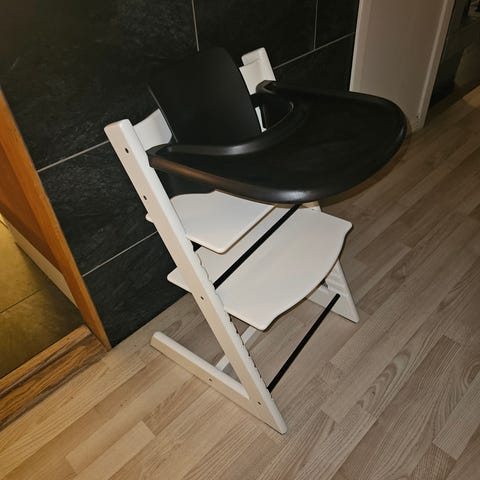 Stokke Tripp Trapp matstol med bricka och sittdyna. Matstolen är utformad för barn och kan justeras i höjd och djup för att passa barnets storlek. Brickan ger en separat mat- och lekyta och sittdynan ger extra komfort och stöd. Passar vid vanliga matbord och kan användas under flera år i takt med att barnet växer. Ny, oanvänd, forfarande i kartong.