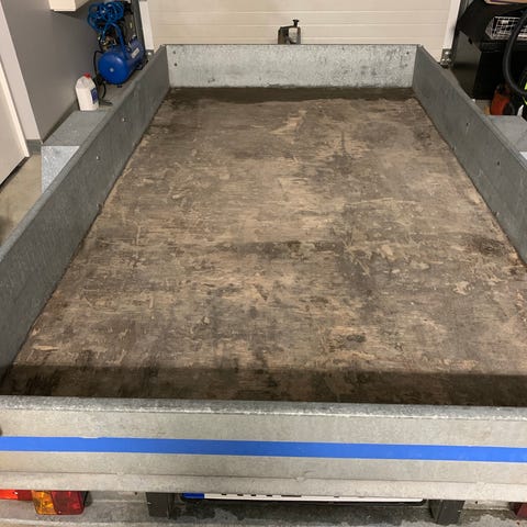 Bilsläp flaksläp i grått utförande. Släpet har ett långt öppet flak med träbotten och metallram. Utrustad med kulkoppling framtill och stödben. Passar för transport av till exempel fordon, byggmaterial eller annat skrymmande gods.