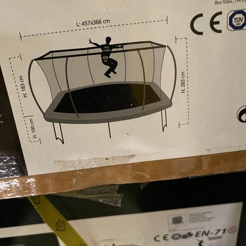 Studsmatta med ben i galvaniserat stål, ramdimension 32 mm. 40 galvaniserade fjädrar. Kantskydd och insides säkerhetsnät med toppring ingår. Maxvikt 50 kg.