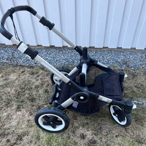 Delarna är i använt men fullt fungerande skick. Enligt ChatGPT passar chassit till Bugaboo Donkey, Donkey 2 och Donkey 3 och tyget och väskan passar samtliga Donkey-modeller.