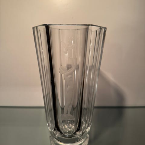 Blomvas i klart glas med fasetterat mönster. Vasen är cirka 22 cm hög och har en öppning på ungefär 9 cm i diameter. Passar för snittblommor eller som dekorativ inredningsdetalj.