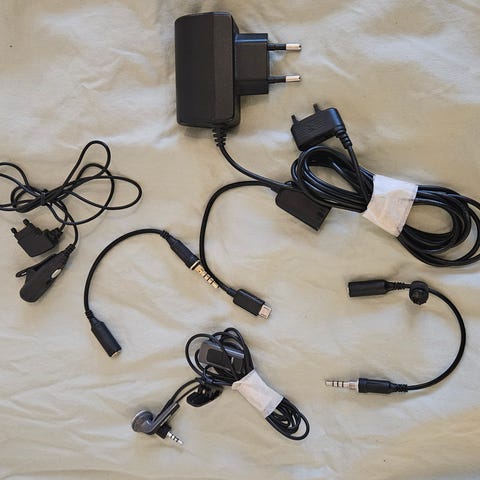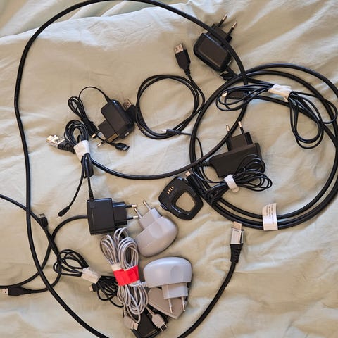 Parti med diverse USB-kablar och en laddare. Innehåller olika typer av USB-kontakter, inklusive micro-USB och mini-USB.
