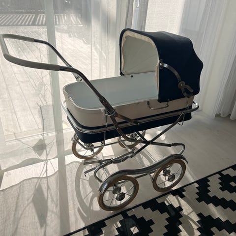 Dockvagn i tidstypisk modell från 1950-talet. Suffletten torr och sprucken i övrigt fint använt skick. En trevlig leksak eller som inredningsdetalj i hemmet eller trädgården.