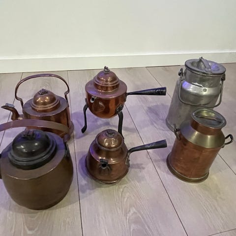 kopparkärl set dekorationskärl i fyra storlekar. Kärlen är tillverkade i koppar med detaljer och handtag i mässingsfärg. Formen är skopliknande med fot, vilket gör dem stabila att ställa på golv eller hylla. Passar som dekorationsföremål inomhus, exempelvis vid eldstad, i hall eller vardagsrum. Setet kan användas tillsammans eller uppdelat i olika rum beroende på önskat uttryck.Den största använde man till för att hämta ved