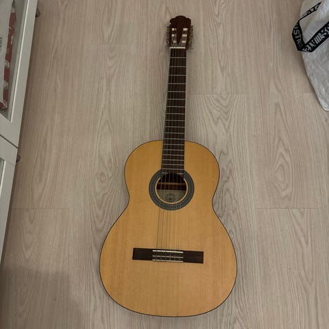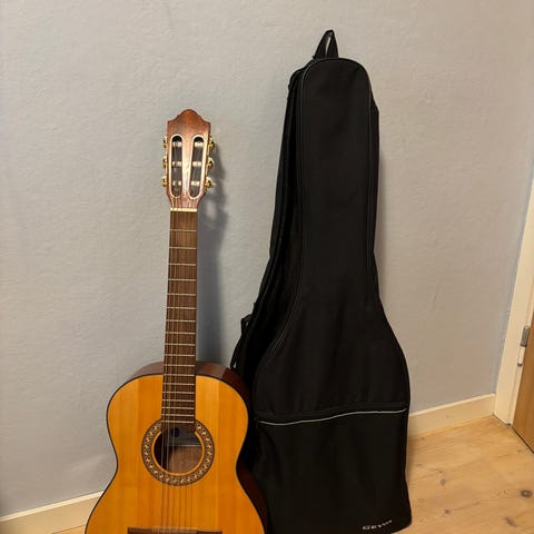 Akustisk gitarr i naturfärgad träfinish. Klassisk modell med nylonsträngar och bandad greppbräda. Lämplig för övning, spel i hemmet eller enklare framträdanden. Gitarren har remfäste och levereras med axelband enligt bild.