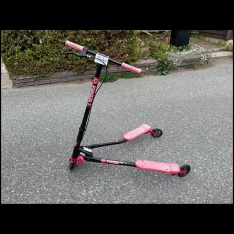 Story sparkcykel i röd och svart färg. Modellen har stora hjul fram och bak för stabil åkning på asfalt och liknande underlag. Utrustad med stänkskärmar, fotbroms på bakhjulet och hopfällbar konstruktion för enklare förvaring och transport. Justerbart styre med snabbfäste gör att höjden kan anpassas efter användaren. Passar för barn och yngre användare som vill ta sig fram på ett enkelt sätt i närområdet.