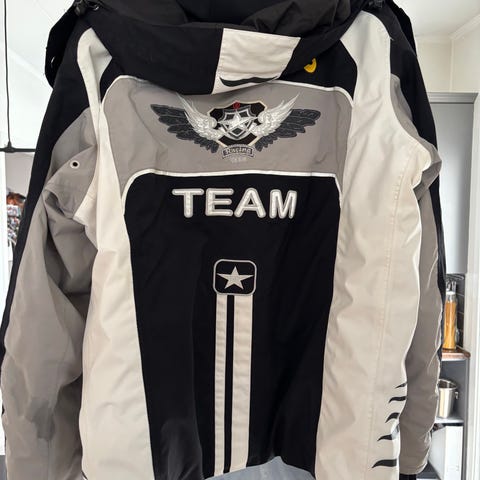 Everest jacka i storlek 36. Jackan är vit med svarta partier på sidor och ärmar. Modellen har huva, dragkedja framtill och två framfickor med dragkedja samt ficka för skidkort på vänster arm. Yttertyget är anpassat för utomhusbruk och ger skydd mot vind och lättare nederbörd. Passar som skidjacka men kan användas för andra friluftsaktiviteter.