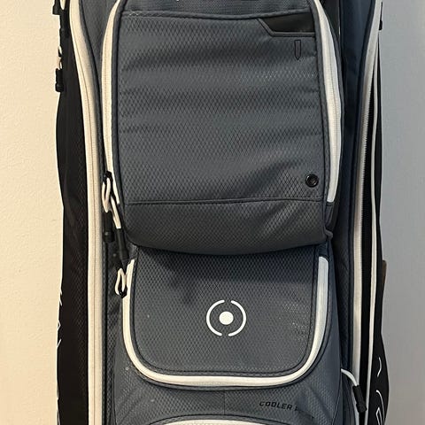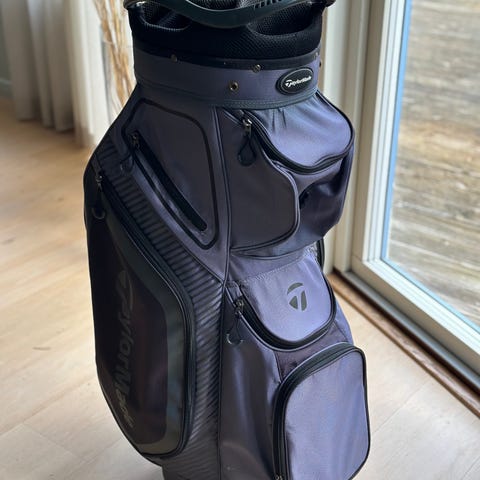 TaylorMade golfbag i vagnmodell i grå och grön färg. Väskan har flera fickor med dragkedja, inklusive isolerad kylficka, samt fack för tillbehör och värdesaker. Designad för användning på golfvagn med stabil botten och bärhandtag upptill. Passar för förvaring och organisering av golfklubbor och utrustning på golfbanan.