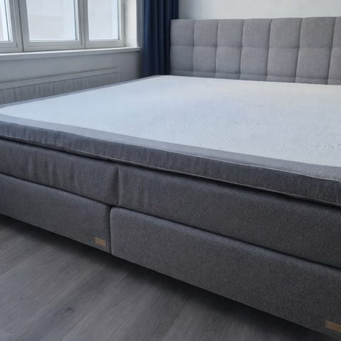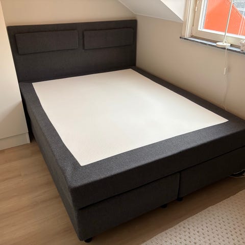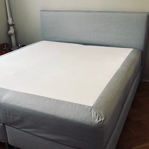 Ekens kontinentalsäng, bestående av två underdelar på träben med en mellanmadrass ovanpå.