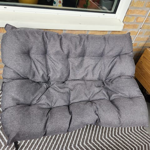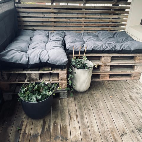 Pallsoffa och soffbord i trä för balkong med tillhörande dyna