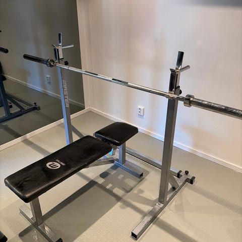 Träningsbänk med tillhörande skivstång och vikter.