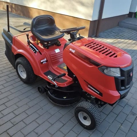 Stiga Tornado 2098 H åkgräsklippare i orange/gul färg. Modellen är utrustad med förarplats med ratt och sits samt klippaggregat monterat under maskinen. Maskinen har fyra hjul och är avsedd för klippning av gräsmattor där man vill sitta och köra i stället för att gå bakom en vanlig gräsklippare. Passar för trädgårdar och grönområden som kräver regelbunden gräsklippning.