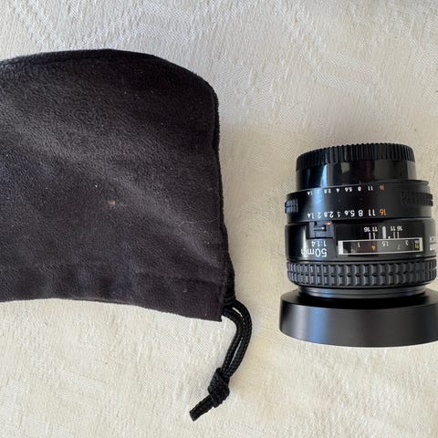 Säljer min AI-s Nikon 50/1.8. Detta är den senaste versionen av Nikons tunna pannkaksobjektiv som fokuserar till 0.6m. Skicket är som nytt.