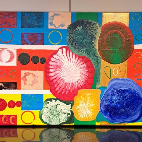 Målad med utspädd akrylfärg och bollarna i mitten är av typ frigolit.
